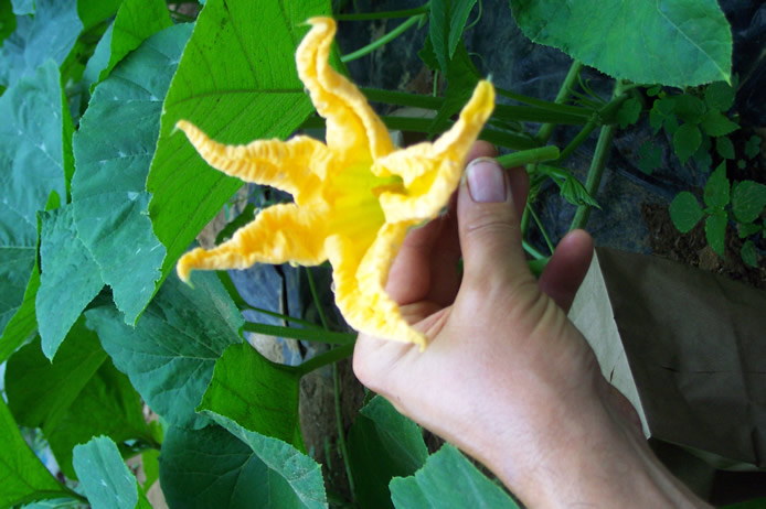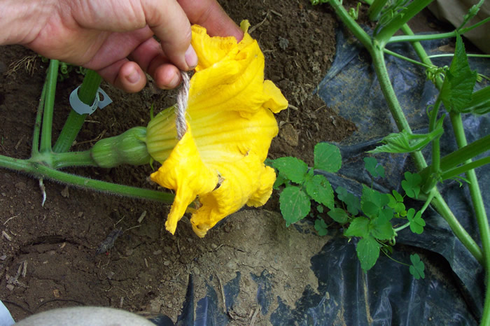 The outer part of the male flower is placed on a squash leaf above and near the bagged female flower before