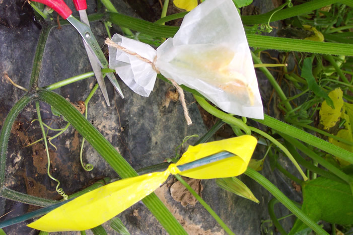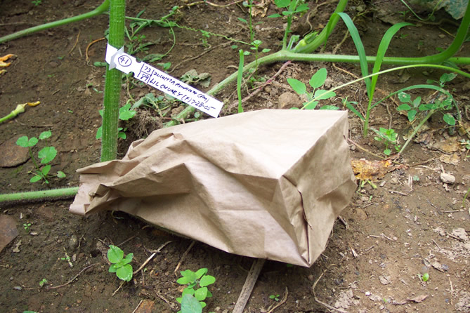 The paper bag is placed back over the female flower to block view of the female flower from polinating insects.